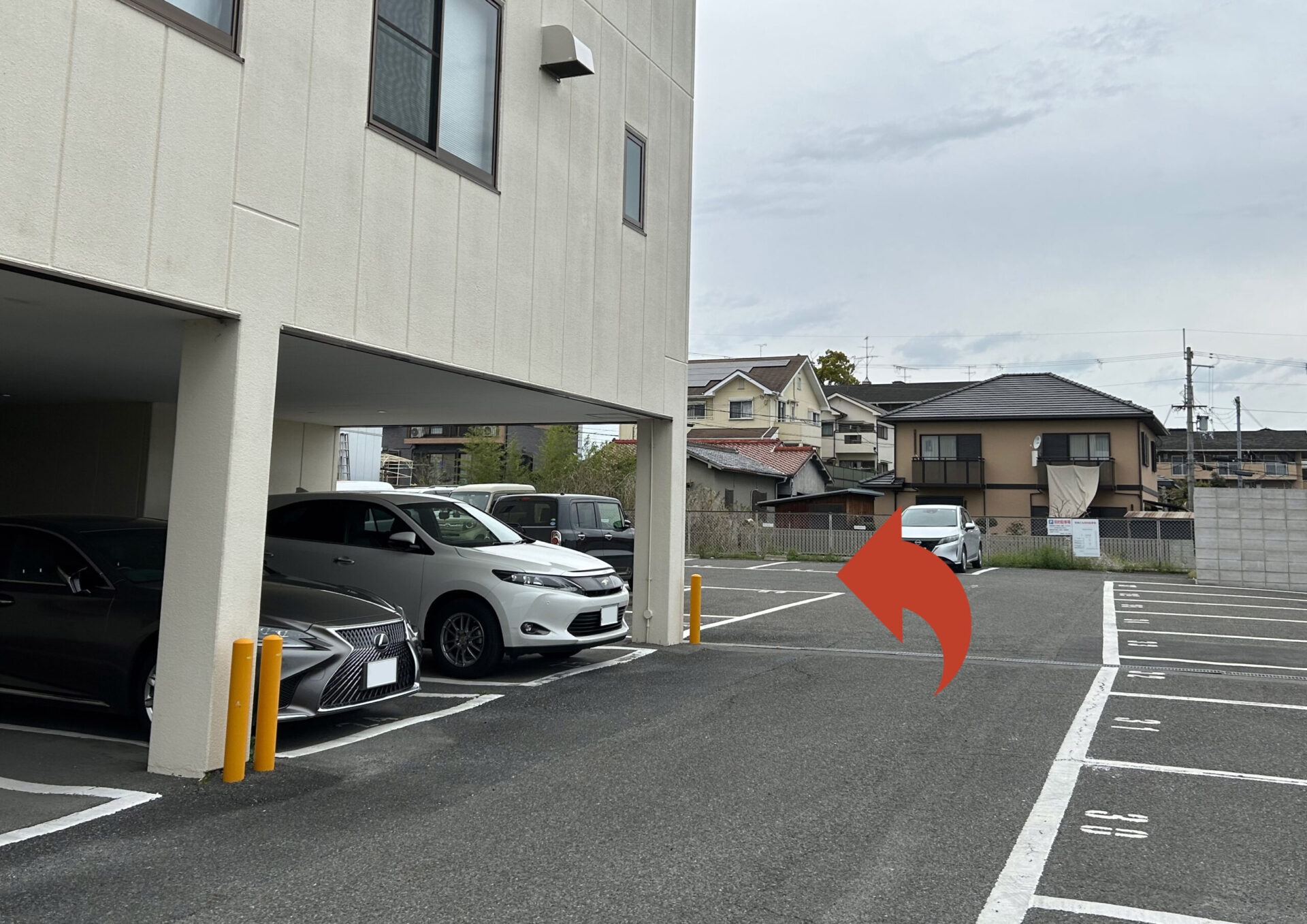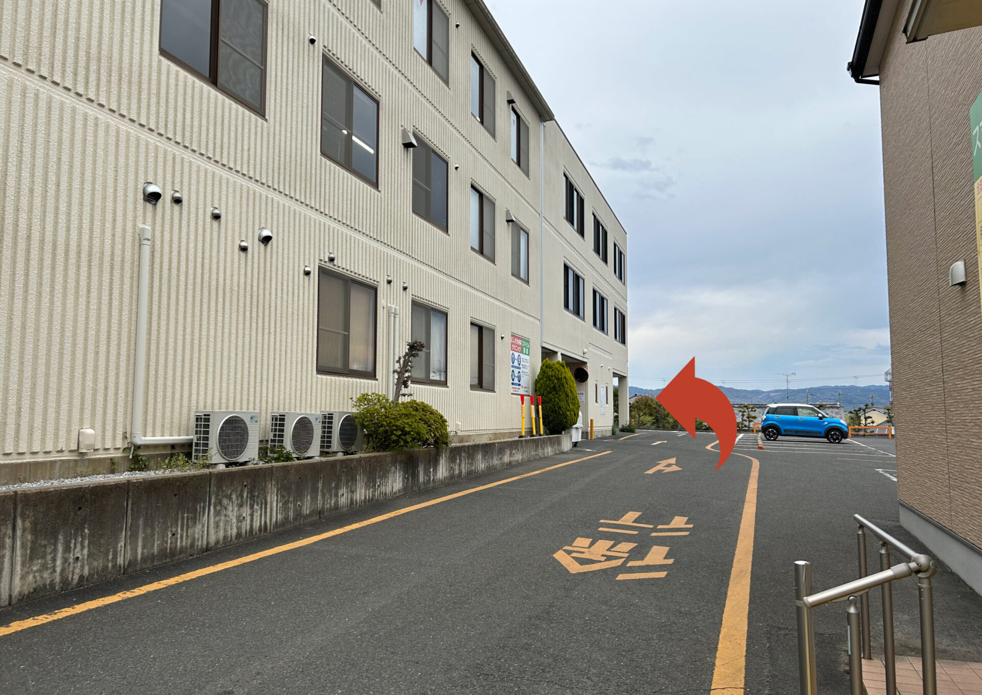 1.平井ビル(1階にしざき内科クリニック・3階明治安田生命のビル)とスマイル薬局の間にある駐車場出入り口よりお入りください。